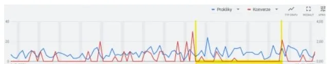 Na grafu je ohraničen vývoj v září loňského roku, kdy najednou došlo k poklesu objednávek z této kampaně, přestože návštěvnost byla podobná jako v minulosti. Takovýto skok směrem dolů u brandové kampaně je charakteristický právě pro období, kdy lidé sice mají o zboží zájem nadále, ale nákup z nějakého důvodu odkládají.