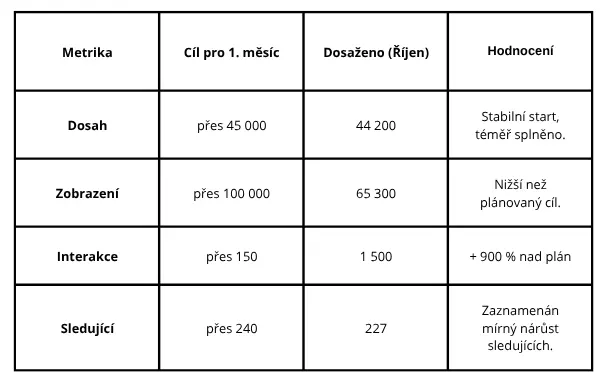 Kampaň jsme nakonec z procesních důvodů odstartovali s měsíčním zpožděním v říjnu s budgetem 3 000 Kč na propagaci příspěvků. Místo plošného proma a drobení rozpočtu jsme se rozhodli finančně podpořit pouze jedno konkrétní video (autentický obsah od zákazníka), u kterého jsme odhadovali největší virální potenciál. To se ukázalo jako klíčový krok. Níže porovnáváme naše původní cíle pro první měsíc (plánované na září) s reálnými čísly dosaženými v říjnu.