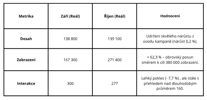 Okamžitý efekt nové strategie (září): Hned v prvním měsíci po nasazení nového typu obsahu jsme zaznamenali obrovský skok. Dosah (okruh diváků) vyrostl o úctyhodných 37,5 % na 138,8 tisíc. Cíl jsme tak nejen splnili, ale s rezervou překonali. Výrazně se probudilo i samotné publikum – interakce s obsahem stouply o 78,6 % na 300, čímž jsme hned překonali plánovanou metu 200 interakcí.
